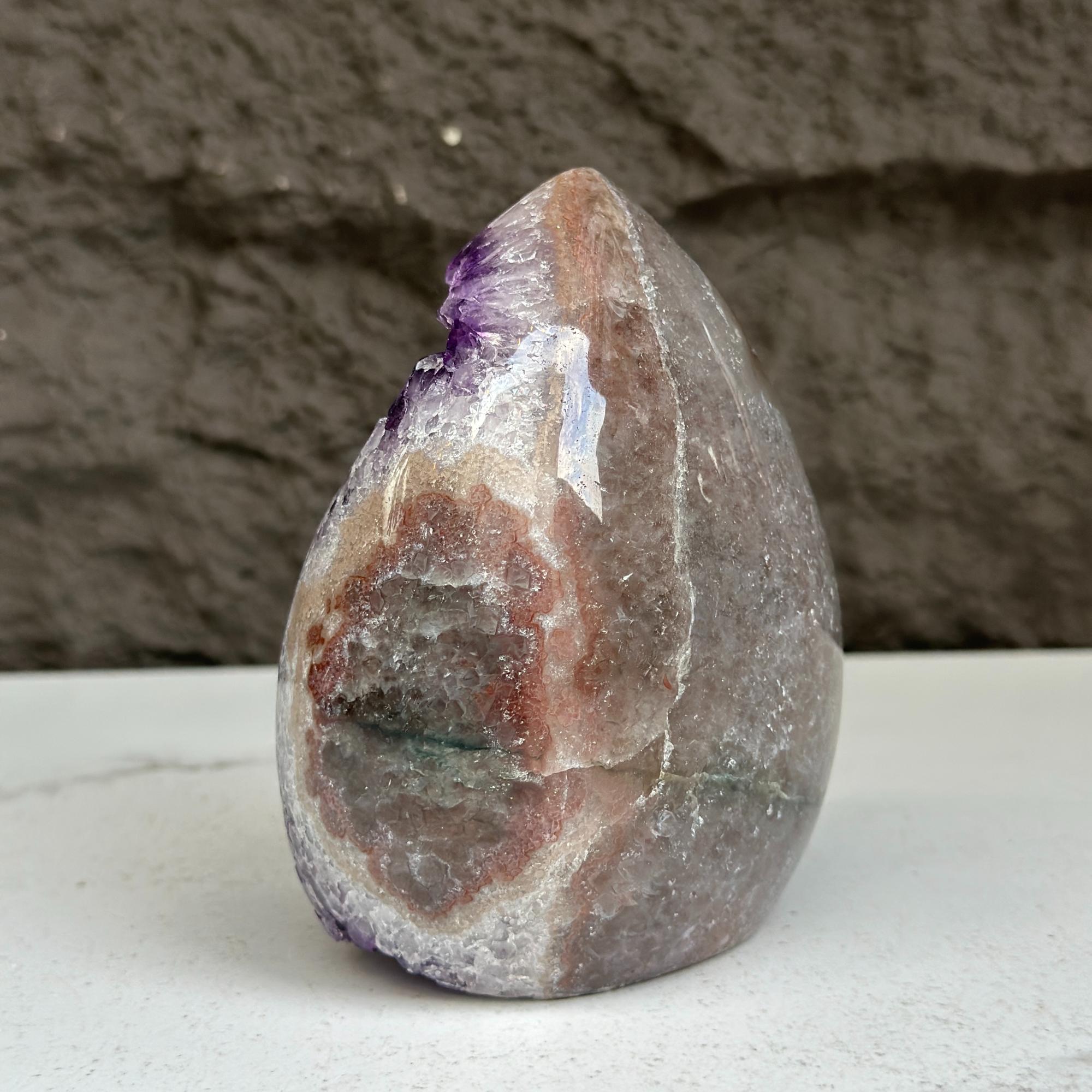 As they are natural stone pieces, they may contain tiny pits and fissures, agate formations, stalactite, calcite, chalcedony, rainbow due to druzy, iron stains that can vary in quantity.