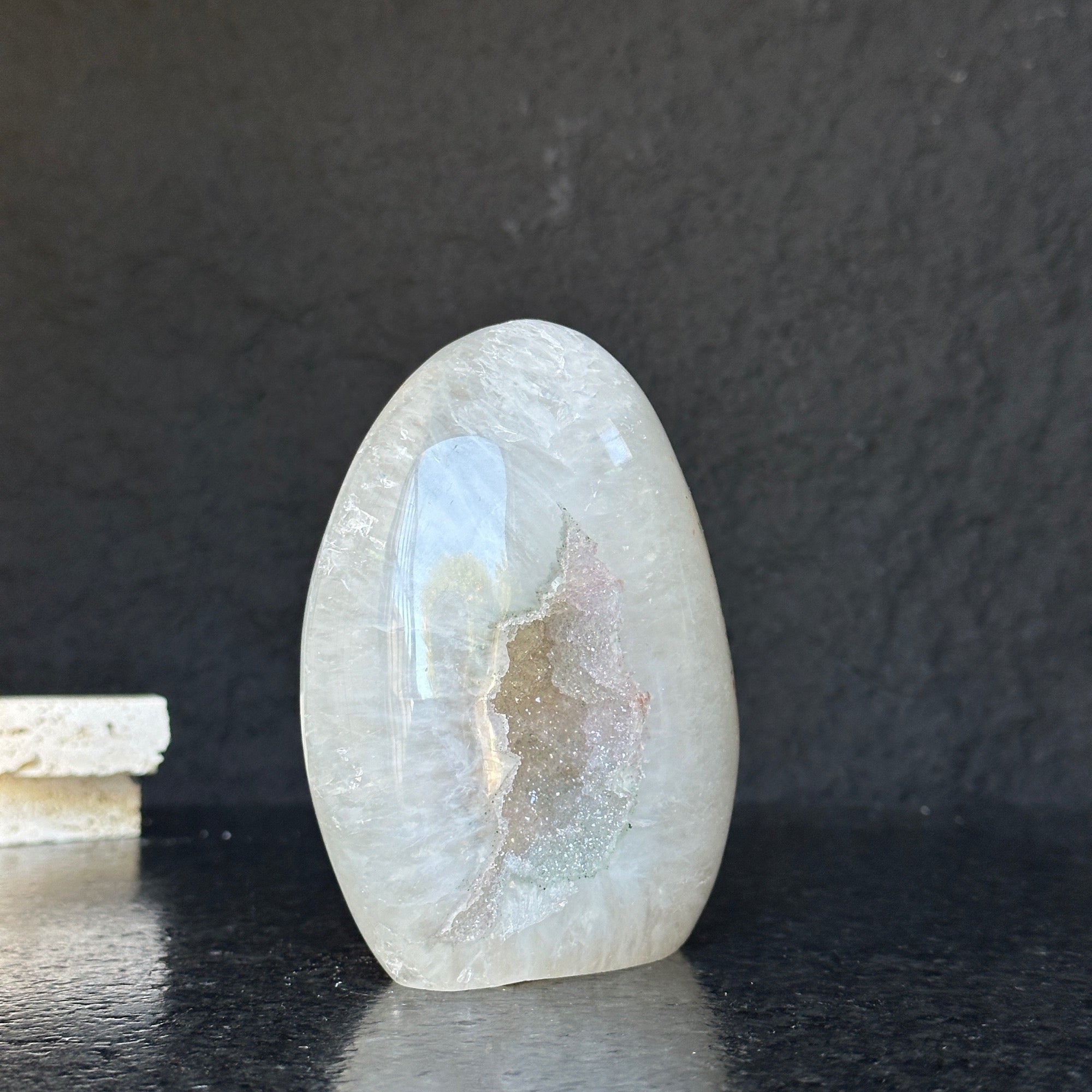 As they are natural stone pieces, they may contain tiny pits and fissures, agate formations, stalactite, calcite, chalcedony, rainbow due to druzy, iron stains that can vary in quantity.