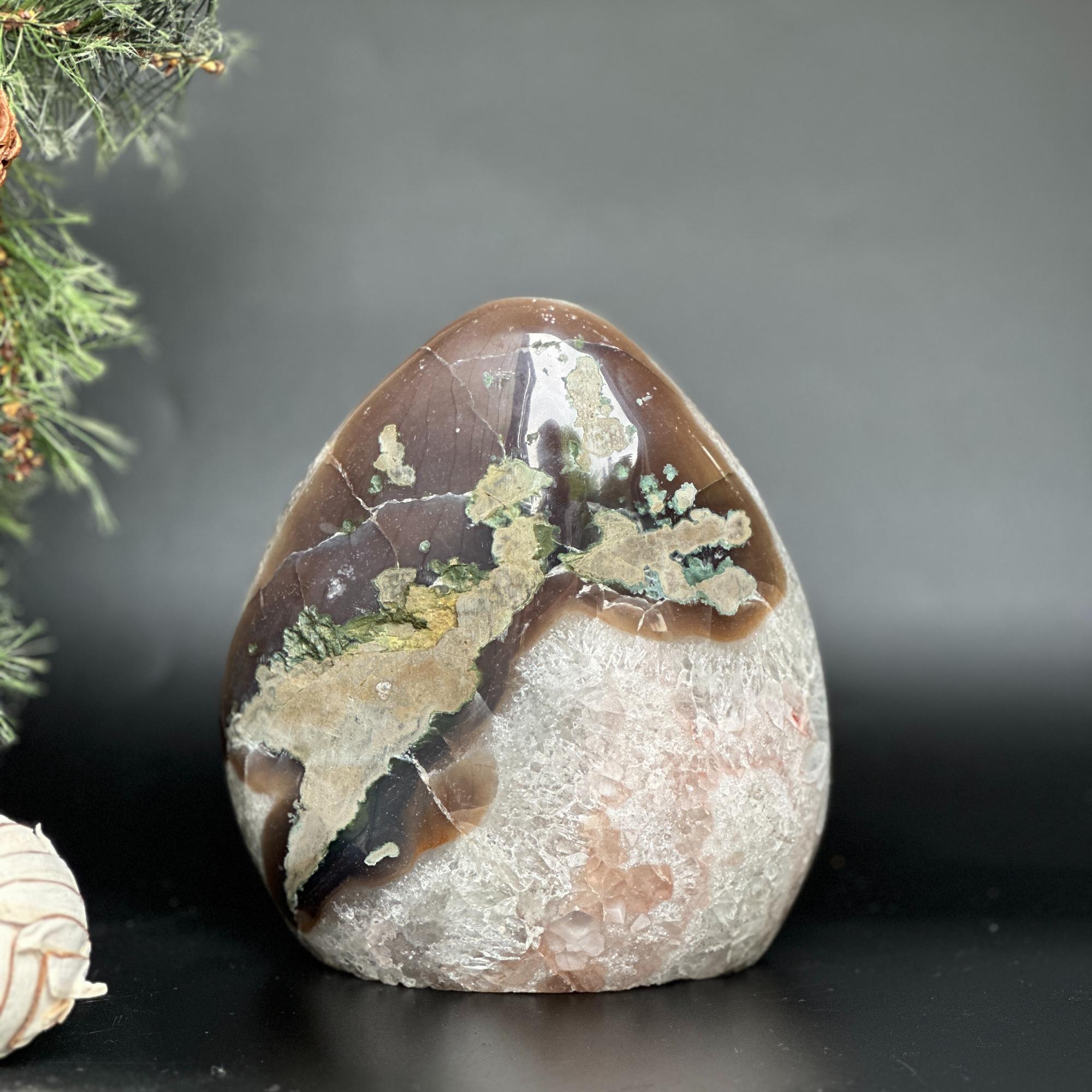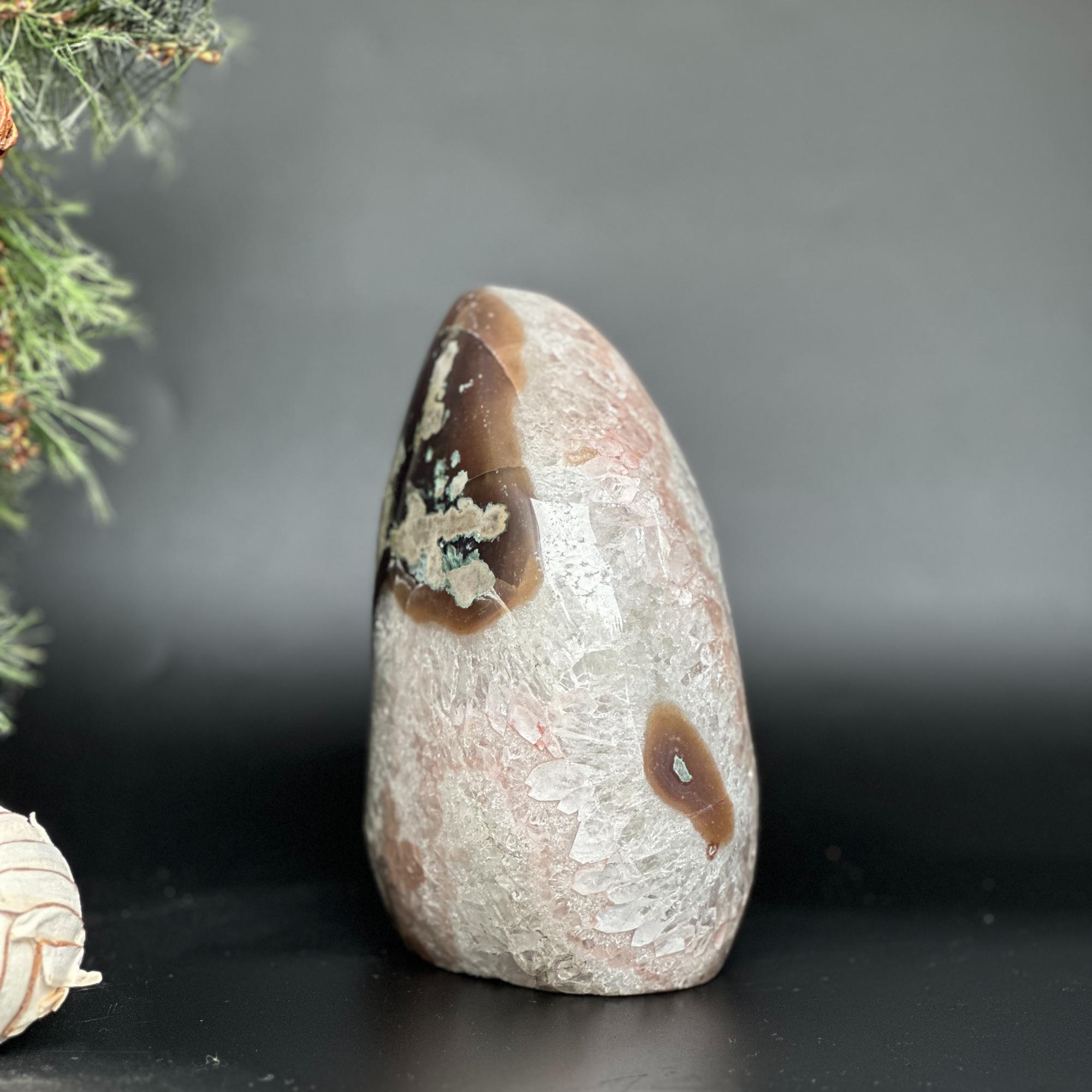 As they are natural stone pieces, they may contain tiny pits and fissures, agate formations, stalactite, calcite, chalcedony, rainbow due to druzy, iron stains that can vary in quantity.