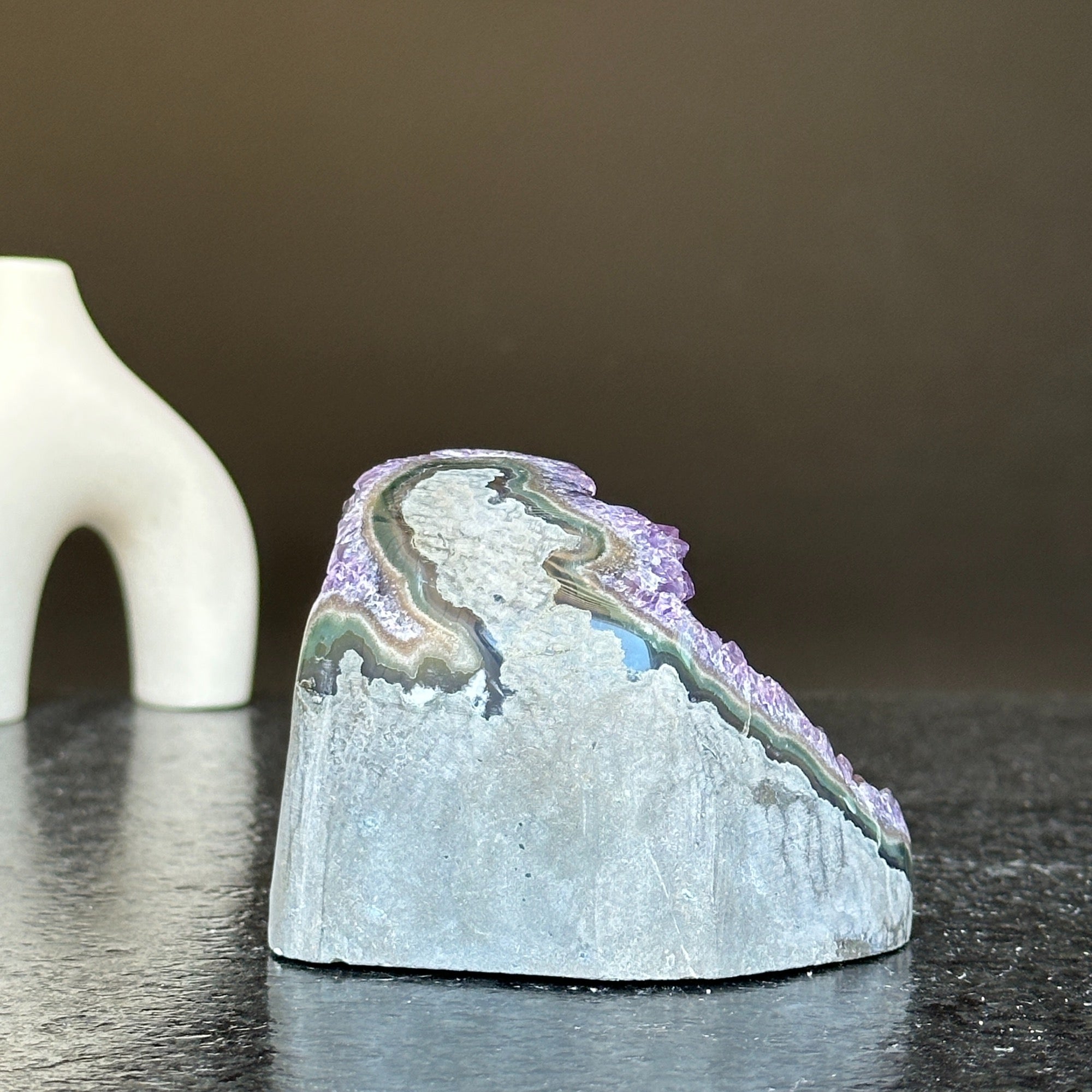 As they are natural stone pieces, they may contain tiny pits and fissures, agate formations, stalactite, calcite, chalcedony, rainbow due to druzy, iron stains that can vary in quantity.