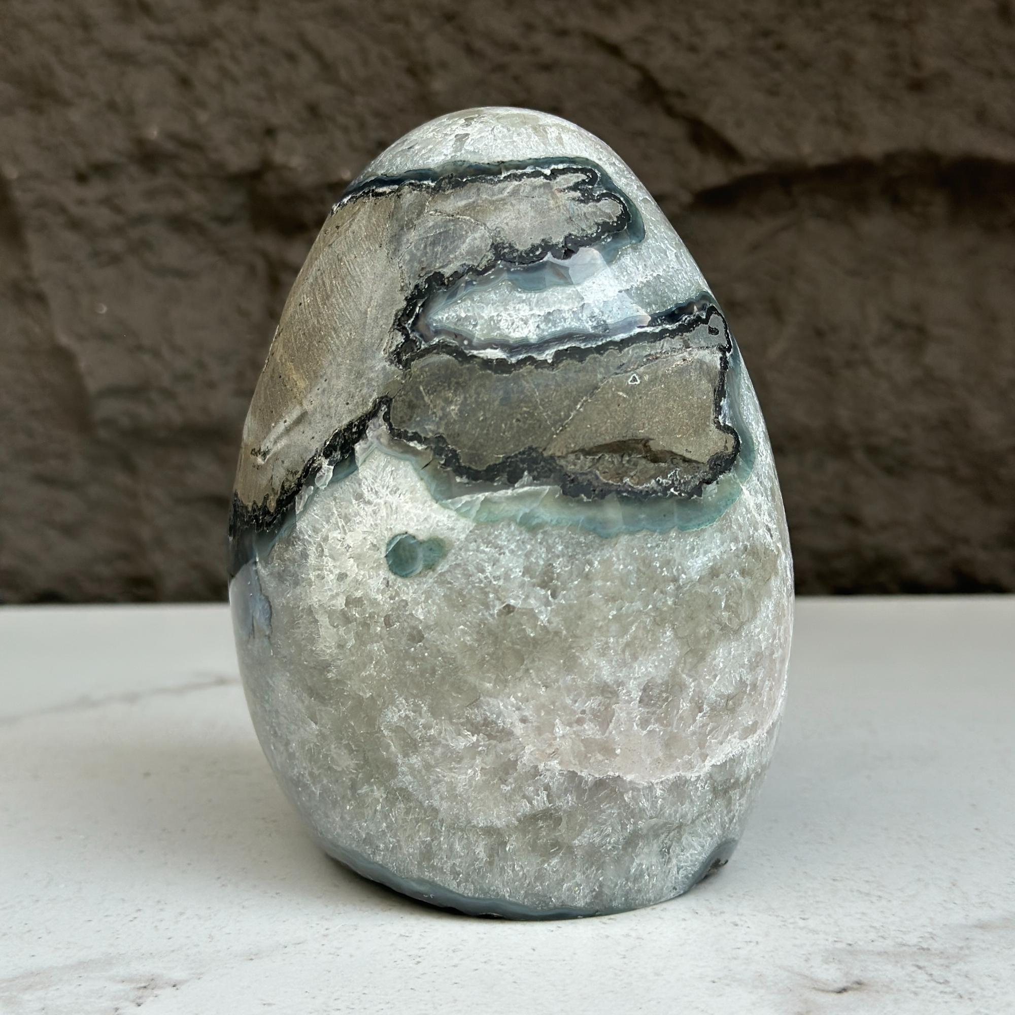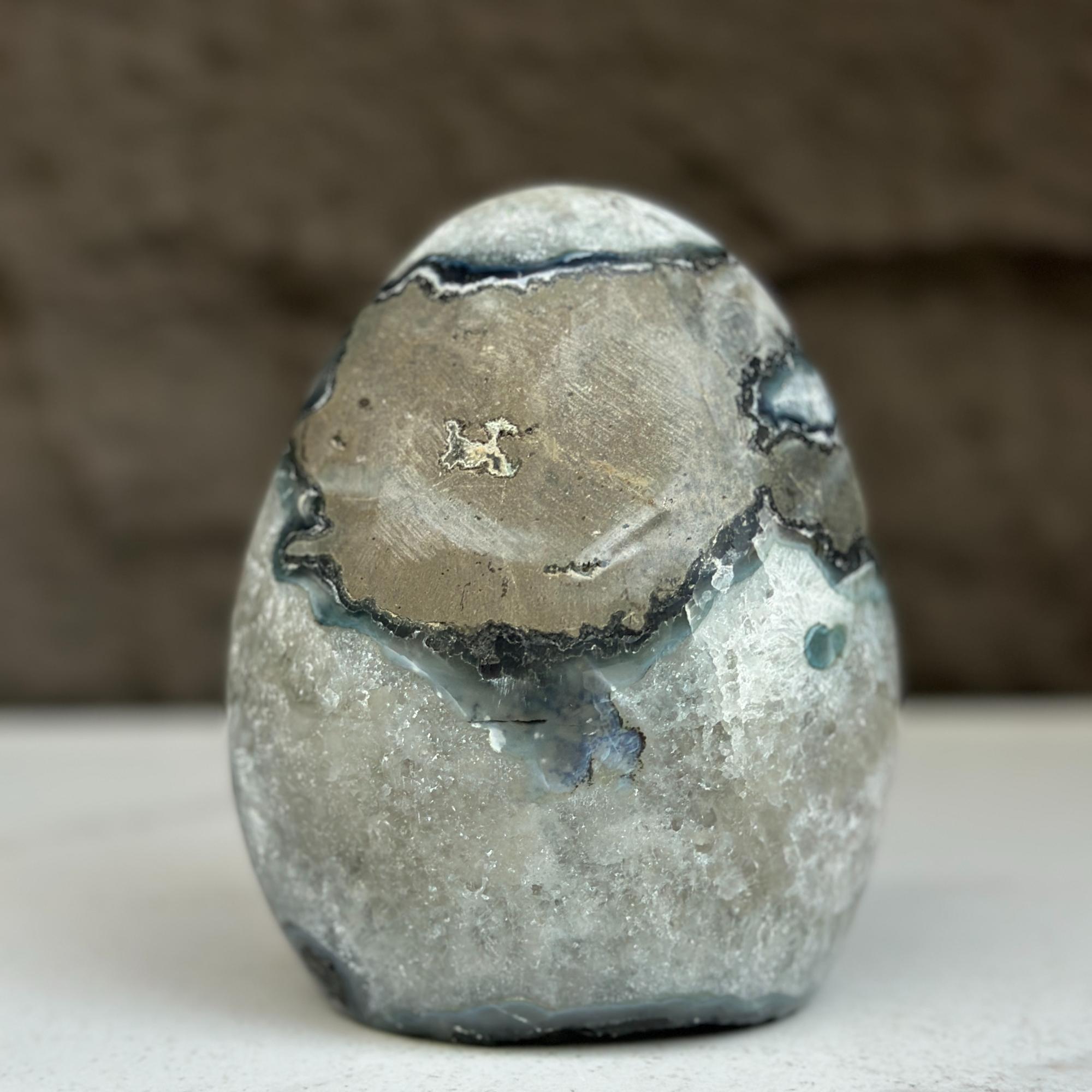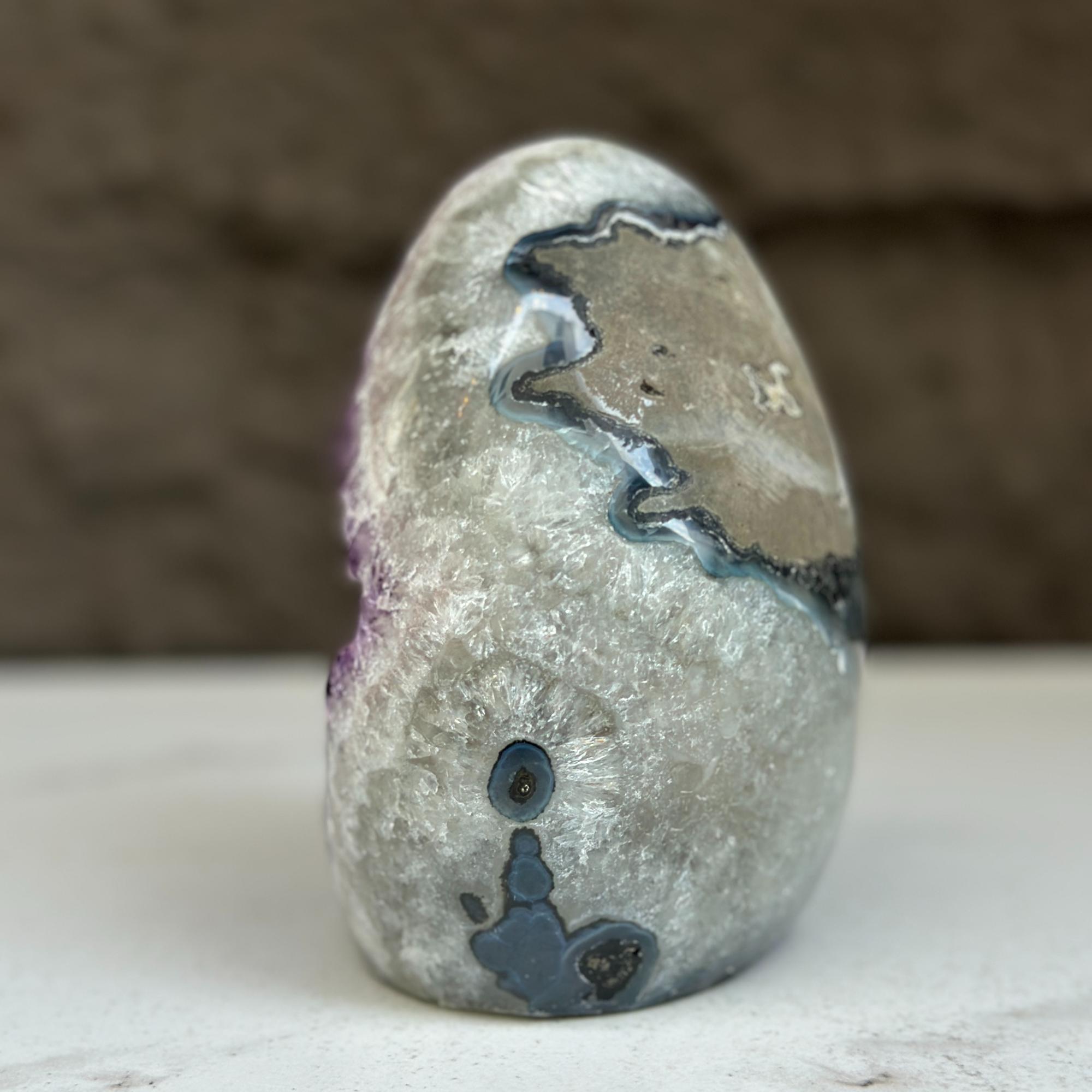 As they are natural stone pieces, they may contain tiny pits and fissures, agate formations, stalactite, calcite, chalcedony, rainbow due to druzy, iron stains that can vary in quantity.
