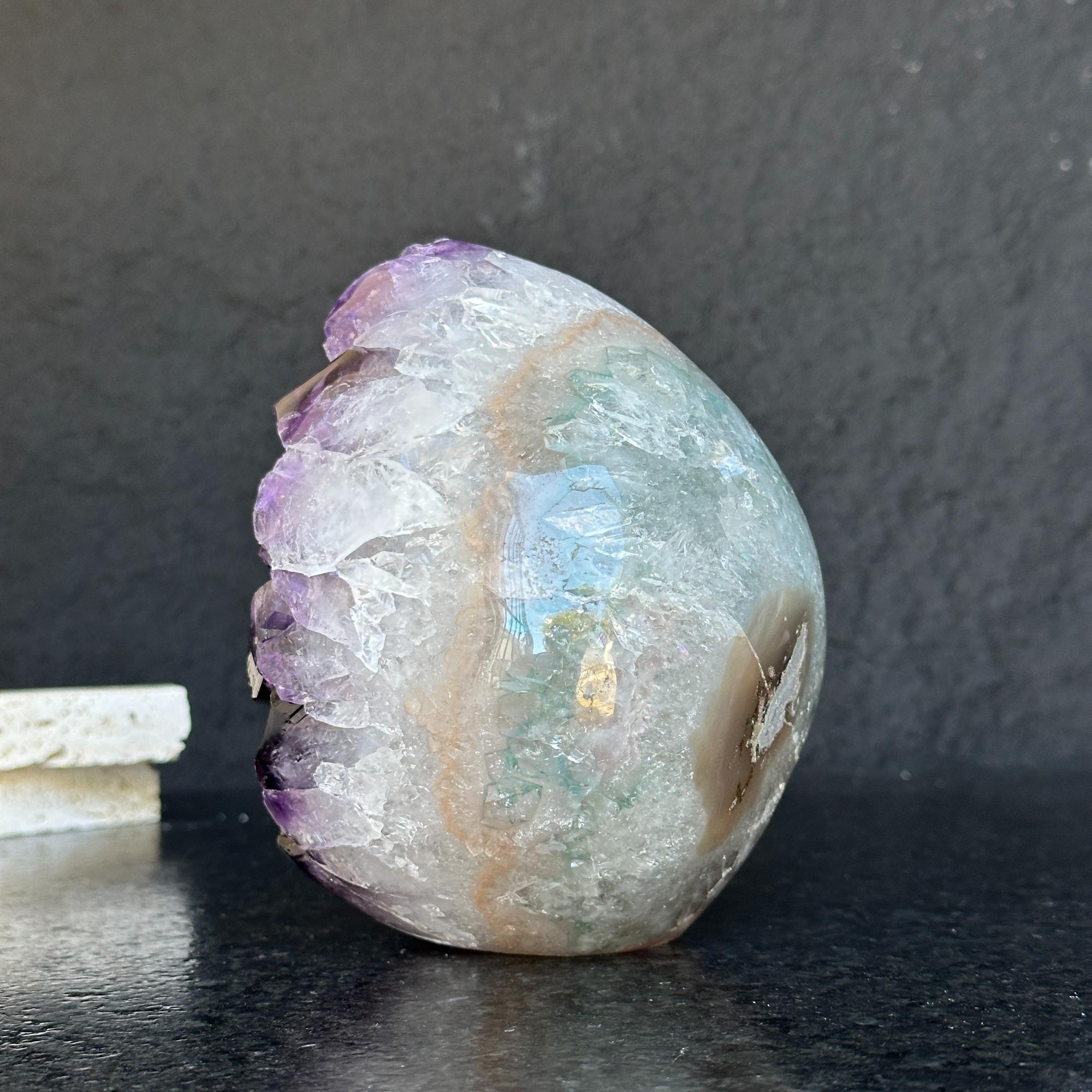 As they are natural stone pieces, they may contain tiny pits and fissures, agate formations, stalactite, calcite, chalcedony, rainbow due to druzy, iron stains that can vary in quantity.